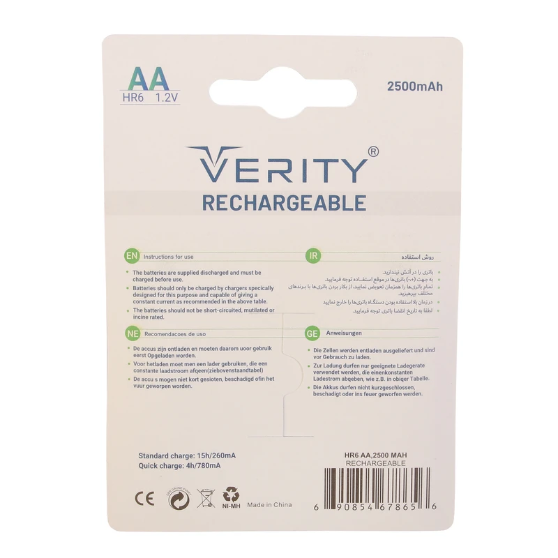 باتری شارژی قلمی Verity گزینهای قدرتمند برای دستگاههایی است که نیاز به انرژی طولانیمدت دارند. این باتری از نوع شارژی Ni-MH است و میتواند بارها شارژ و استفاده شود. با طراحی استاندارد AA، این باتری برای استفاده در وسایل مختلفی همچون ساعت دیواری، اسباببازی، دوربین دیجیتال و چراغ قوه کاربرد دارد. استفاده از باتریهای شارژی Verity هم صرفهجویی اقتصادی دارد و هم به کاهش تولید زباله کمک میکند.