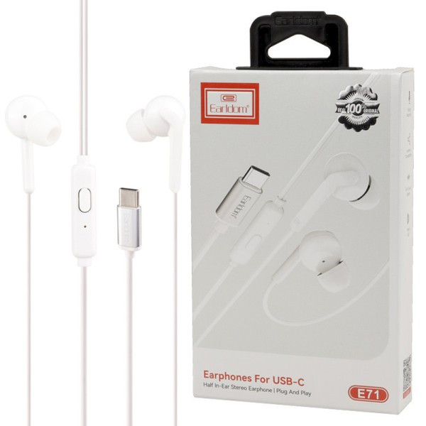 هندزفری تایپ سی ارلدام مدل E71،جز هندزفری های سیمی برند EARLDOM است که از کیفیت قابل قبولی برخوردار میباشد. جنس بدنه این محصول از پلاستیک با روکش TPE ساخته شده و مقاومت خوبی در برابر کشیده شدن و پاره شدن دارد. طول کابل نیز 120 سانتی متر است و از طریق کانکتور type-c به دستگاه شما متصل میشود. این هندزفری سیمی ارلدارم e71،به صورت ارگونومیک طراحی شده و سری های سیلیکونی باعث شده تا به خوبی درون گوش شما قرار گیرد. کلید های فیزیکی تعبیه شده بر روی کابل این وسیله،به شما این امکان را می دهد تا مدیریت موسیقی و مکالمه خودرا را بر عهده بگیرید و بتوانید میزان صدارا کم و زیاد کنید. میکروفون داخلی نیز این امکان را می دهد تا بتوانید با آن به مکالمه مود نظر خود بپردازید. دقت داشته باشید این هندزفری با سیم ارلدام مدل EARLDOM E71،فقط به گوشی های دارای پورت تایپ سی متصل میشود و برای دستگاه هایی که فاقد ورودی هندزفری 3.5mm یا همان پورت AUX هستند، قابل استفاده می باشند