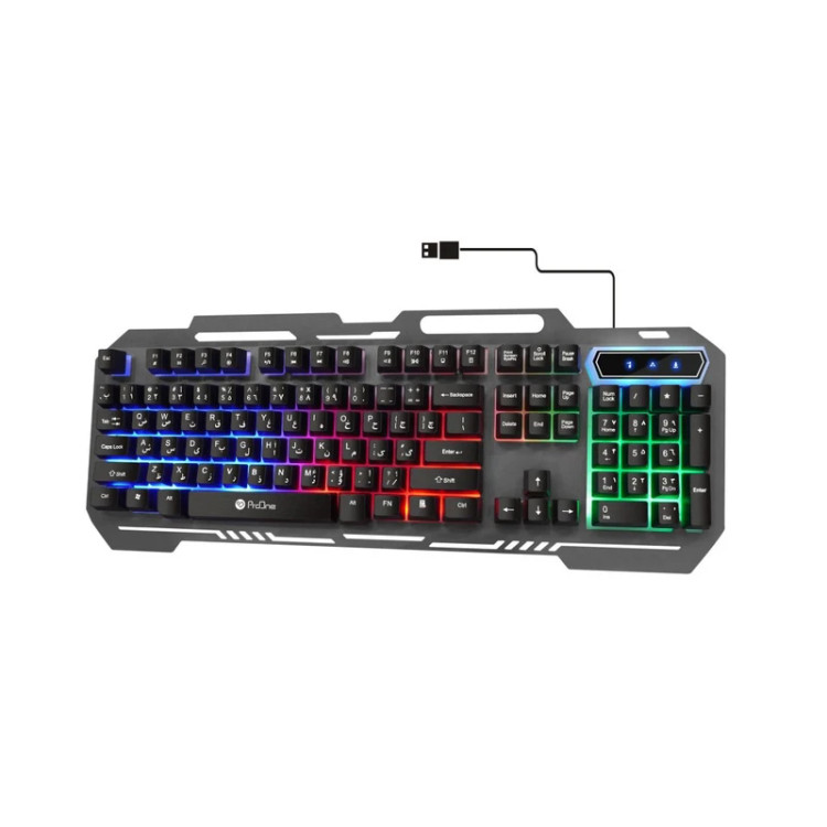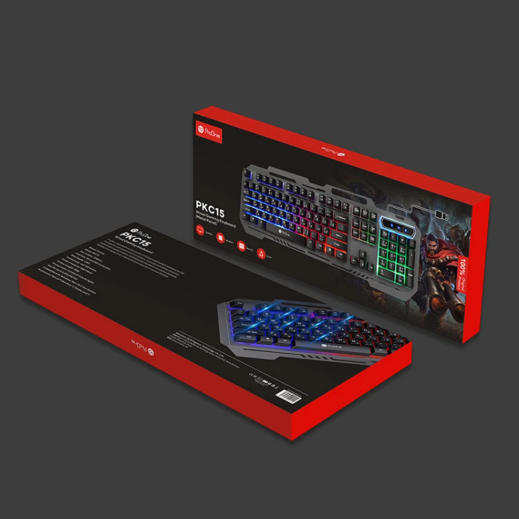 کیبورد گیمینگ ProOne PKC15 دارای ۱۰۴ کلید جزیرهای با نور پسزمینه RGB و حک فارسی روی کلیدهاست. بدنهی مقاوم از پلاستیک ABS چهرهای حرفهای دارد و دارای مخزن آب برای جلوگیری از آسیب است . کلیدهای FN امکان دسترسی به ۱۲ عملکرد مالتیمدیا را فراهم میکنند، و عمر کلیکی حدود ۵ میلیون بار ارائه میشود. این کیبورد گیمینگ، پایه قابل تنظیم ارتفاع، استانداردهای FCC/CE/ROHS و ابعاد بزرگ (~465×158×40 mm) دارد