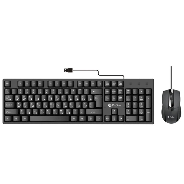 این پکیج ProOne PMK10 ترکیبی خوشقیمت و کاربردی از کیبورد و موس سیمی است. کیبورد ۱۰۴ کلیده با کلیدهای مقاوم (تا ۵ میلیون کلیک) و حک لیزری فارسی دارد .موس همراه دارای حسگر اپتیکال ۱۰۰۰–۱۶۰۰ DPI و طول کابل ۱.۵ m است . ابعاد کیبورد ~470×155×20 mm و وزن ~430 g است که برای استفاده روزمره مناسب است