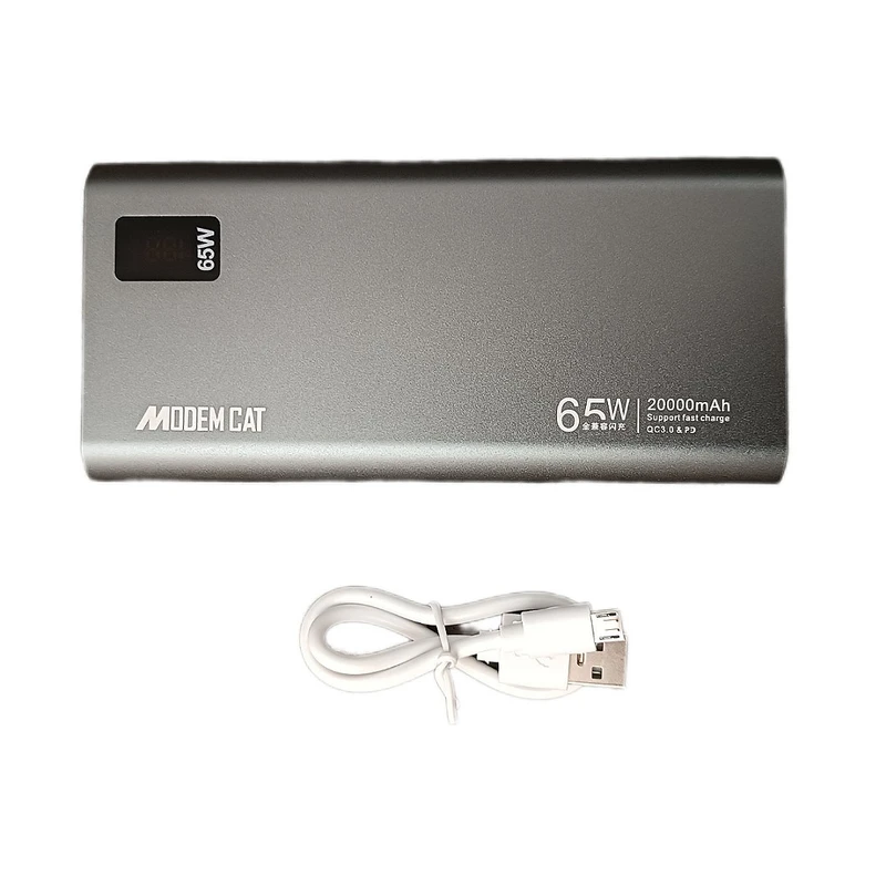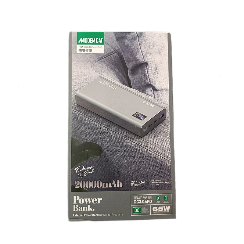 پاوربانک Modem Cat MPB‑010 دارای ظرفیت ۲۰۰۰۰ mAh (~۷۴ Wh)، با پشتیبانی از USB-A، Micro‑USB و PD (Power Delivery) است. ورودی چندگانه با بازههای ۵–۱۲ V و خروجی PD تا ۱۲ V/1.5 A و ۵ V/4.5 A میباشد. مجهز به نمایشگر دیجیتال وضعیت شارژ و محافظهای ایمنی کامل است .