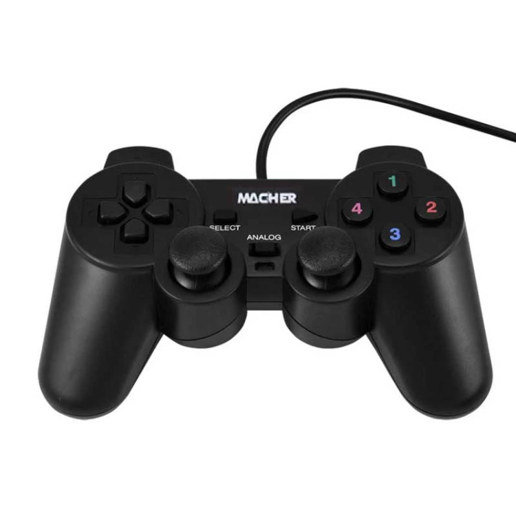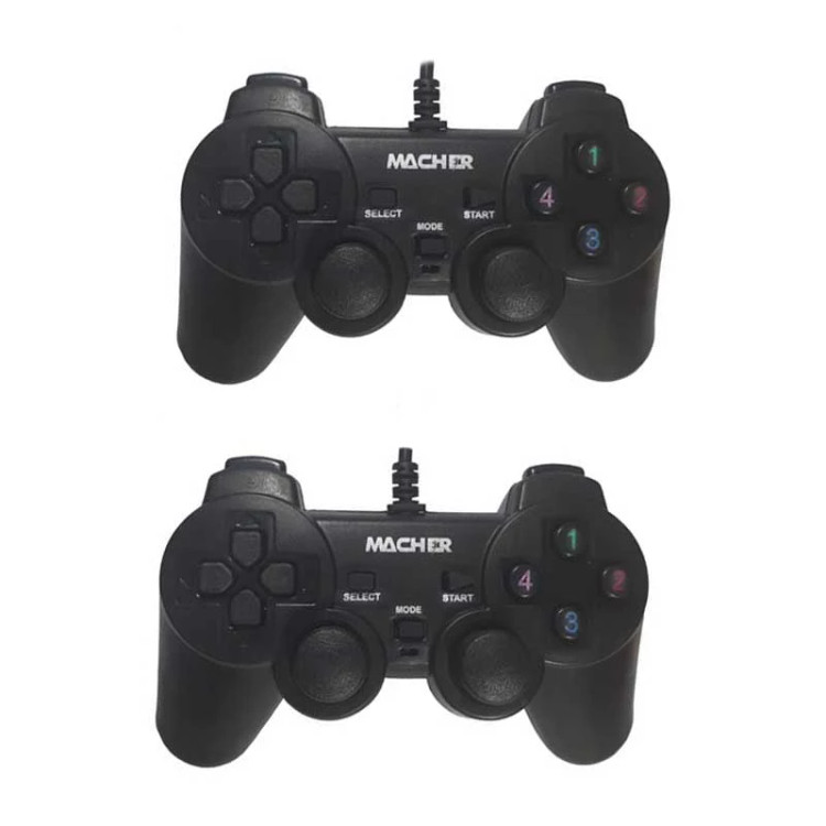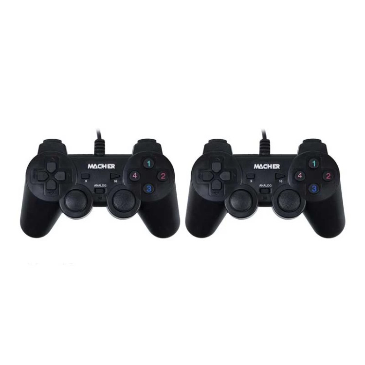 بسته Macher MR‑58 شامل دو گیمپد سیمی شوکدار است که از طریق USB به کامپیوتر متصل میشوند. هر دسته دارای قابلیت شوک دو موتوره، ۱۵ کلید فشاری (شامل دکمههای حرکتی و شانهای)، و طراحی ارگونومیک است. کابل بلند (~۱٫۵–۱٫۸ متر) اتصال با ثبات دارد و بدنه از پلاستیک مقاوم ساخته شده. این مدل Plug & Play بوده، دارای نور LED برای حالت شوک و کنترل آسان با ویندوز است. وزن حدود ۲۵۰ گرم و ابعاد متوسط آن (~۱۹۰×۲۵۰×۲۱۰ mm) کنترل راحتی را فراهم میکند و برای گیمینگ دو نفره یا جایگزین دسته کنسول بسیار مناسب است.
