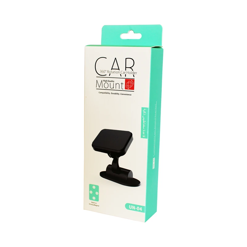هلدر UN-04 بهصورت مگنتی با پد چسبنده یا گیره نصب روی داشبورد ارائه میشود. دارای آهنربای قدرتمند NdFeB با چهار قطب مغناطیسی بوده که تثبیت محکمی برای گوشی فراهم میکند. امکان چرخش ۳۶۰ درجه برای تنظیم زاویه دید دلخواه وجود دارد. بدنه از پلاستیک ABS مقاوم ساخته شده و پد سیلیکونی از خطخوردگی موبایل جلوگیری میکند. طراحی جمعوجور داشته و برای استفاده روزمره در خودرو مناسب است.
